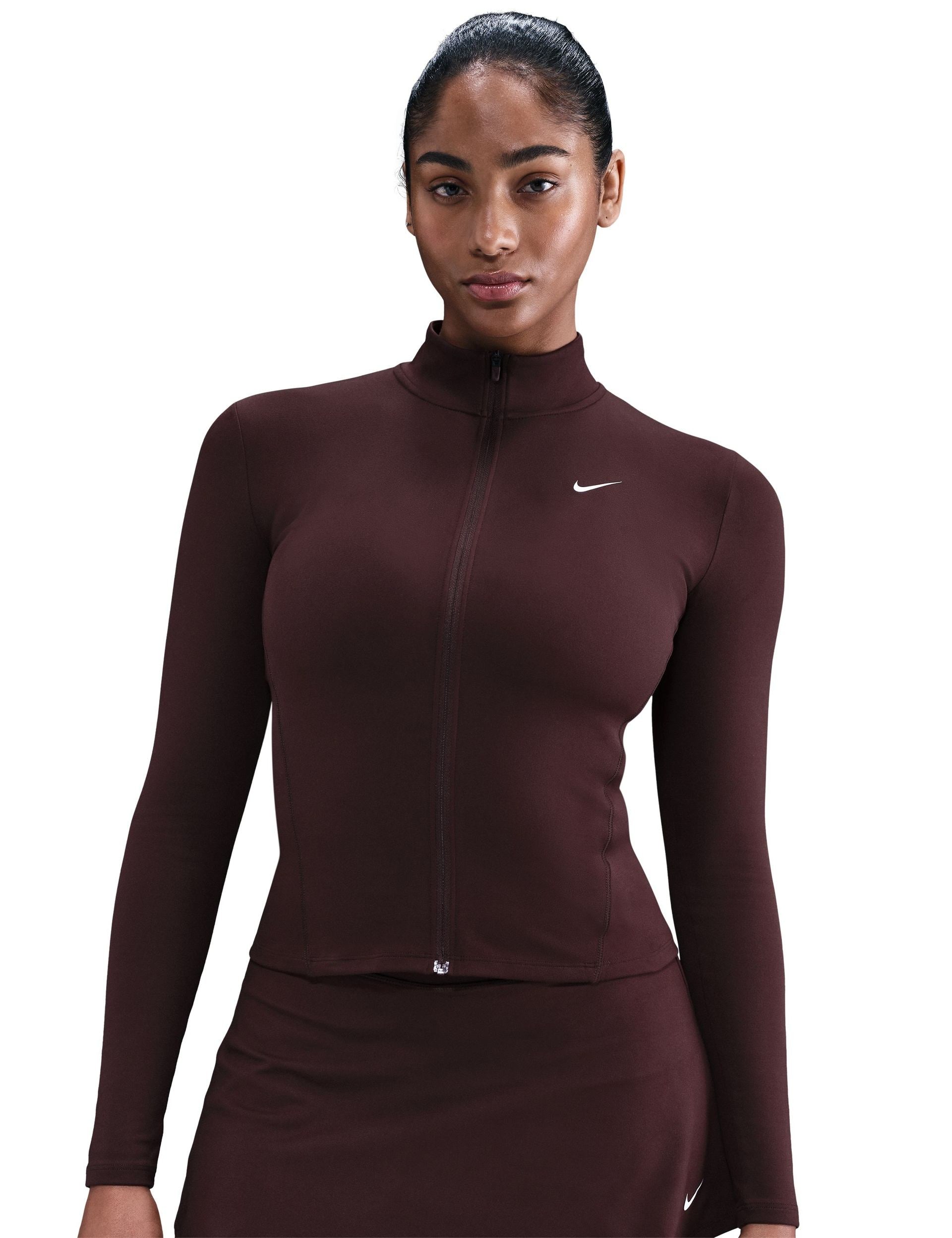 Turn up your training routine in the One Fitted Dri-FIT Full-Zip Jacket, crafted with peachy-soft, four-way stretch fabric for a fitted, comfortable feel that moves with you during power workouts. Dri-FIT technology ensures moisture-wicking and quick-drying performance, keeping you cool and dry, while the full-zip design makes it easy to layer, so it's ideal for strength training or cardio.