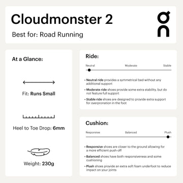 Meet the Cloudmonster 2 from On Running: more cushioning, more propulsion and more energy return than ever before. Featuring their biggest CloudTec cushioning ever, it combines dual-density Helion superfoam with their signature updated nylon-blend Speedboard for softer landings and better impact absorption. Increased energy return, forward momentum, and powerful take-offs make for an irresistible road run.