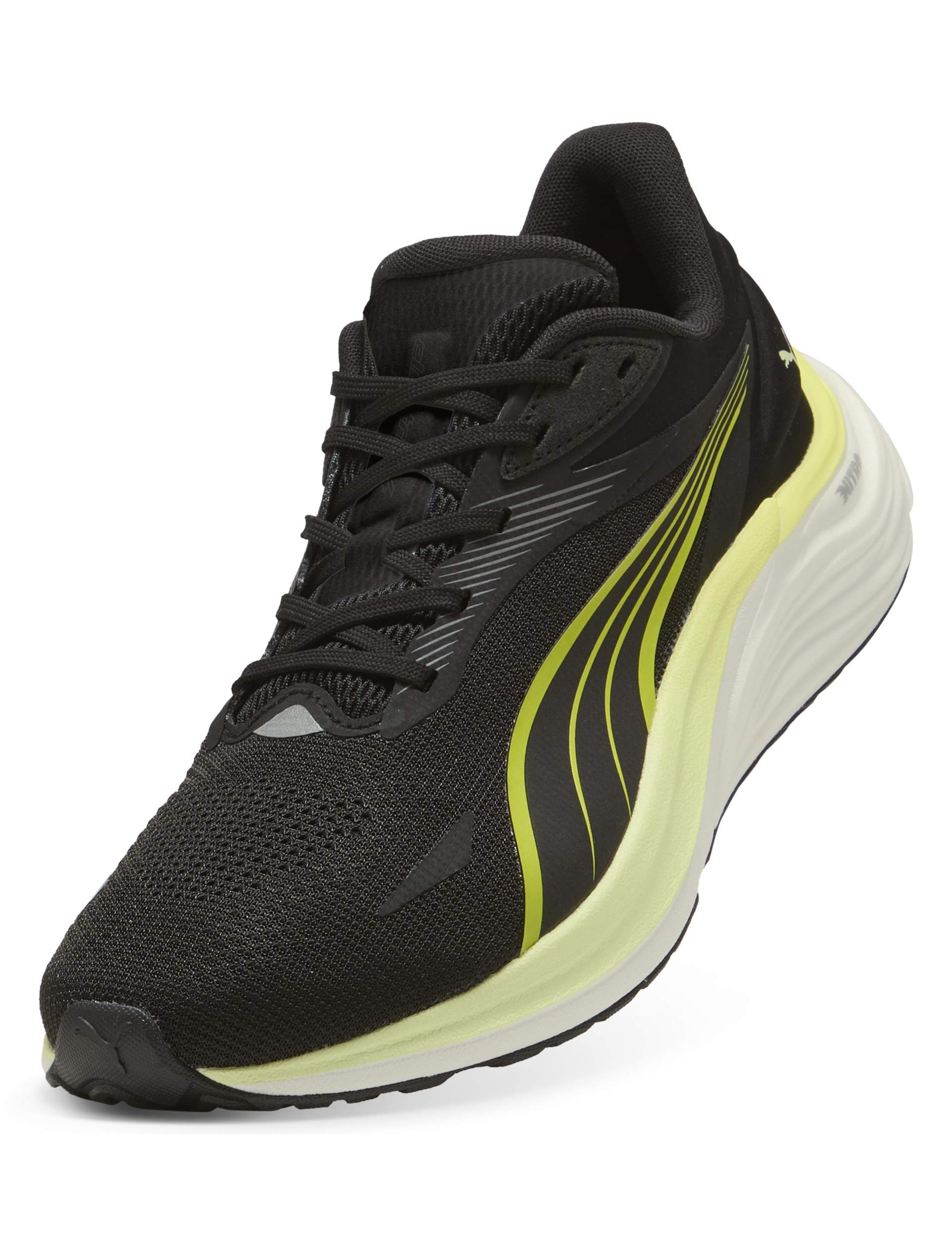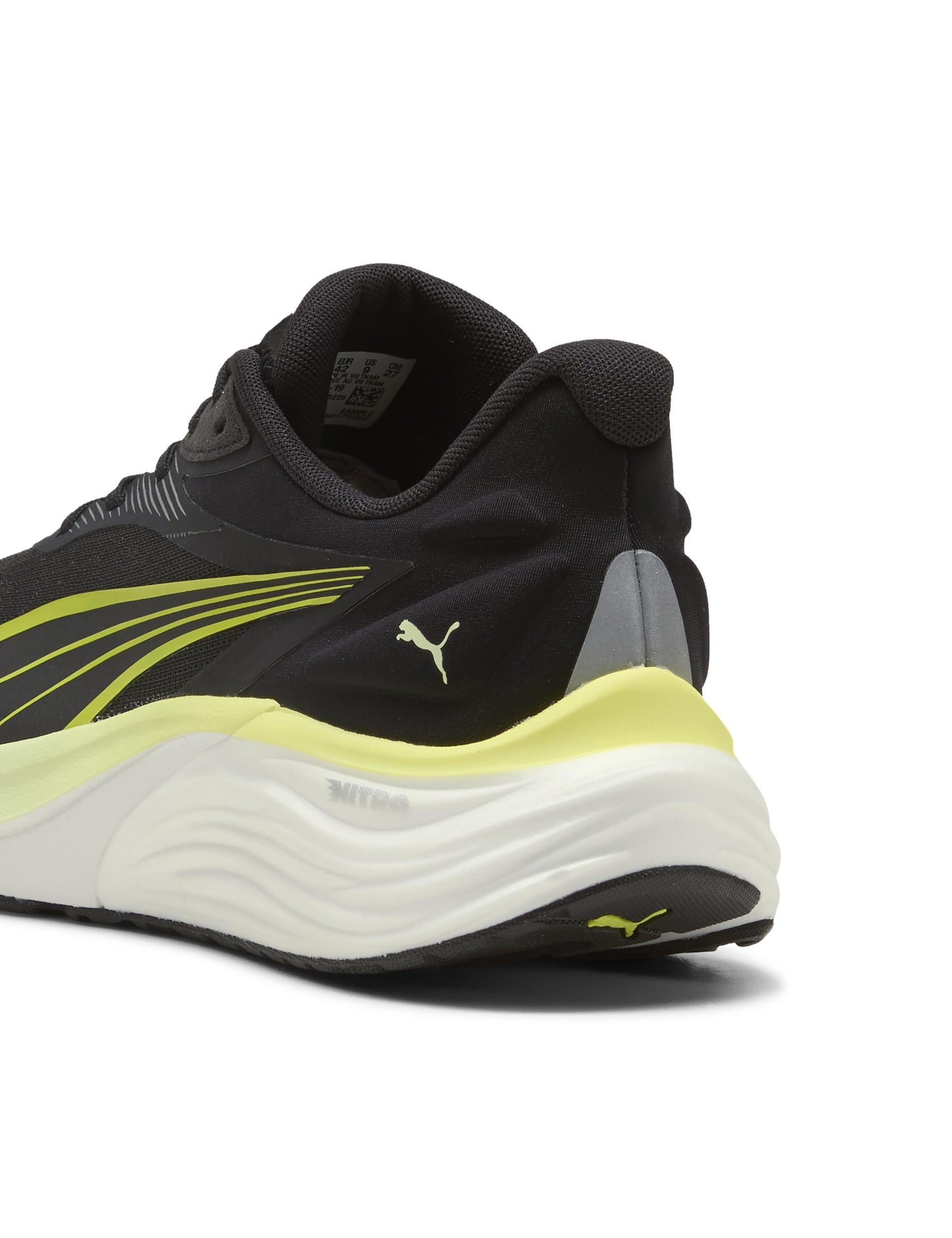 Find your rhythm in the Electrify Nitro 4 in Puma Black/Apple Spritz/Lux Lime. Dual-density cushioning blends Nitro foam with ProFoamLite for smooth transitions and lively toe-offs, while an engineered mesh upper enhances airflow. PUMAGRIP rubber delivers confident road running traction in varied conditions.