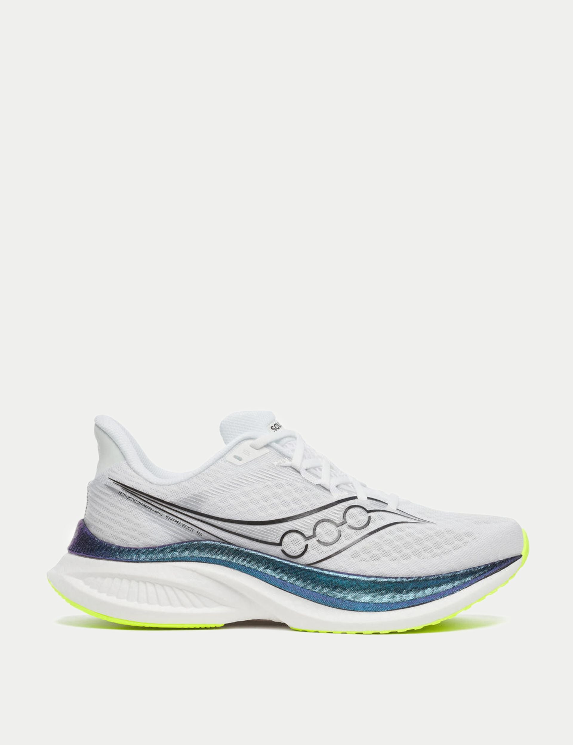 The Saucony Endorphin Speed 5 in White/ Nightsky is tuned for speed with a lively midsole, a winged plate for snappy toe-offs, and a smooth rocker that propels every stride. A secure, breathable fit and grippy outsole keep you confident on fast road miles.