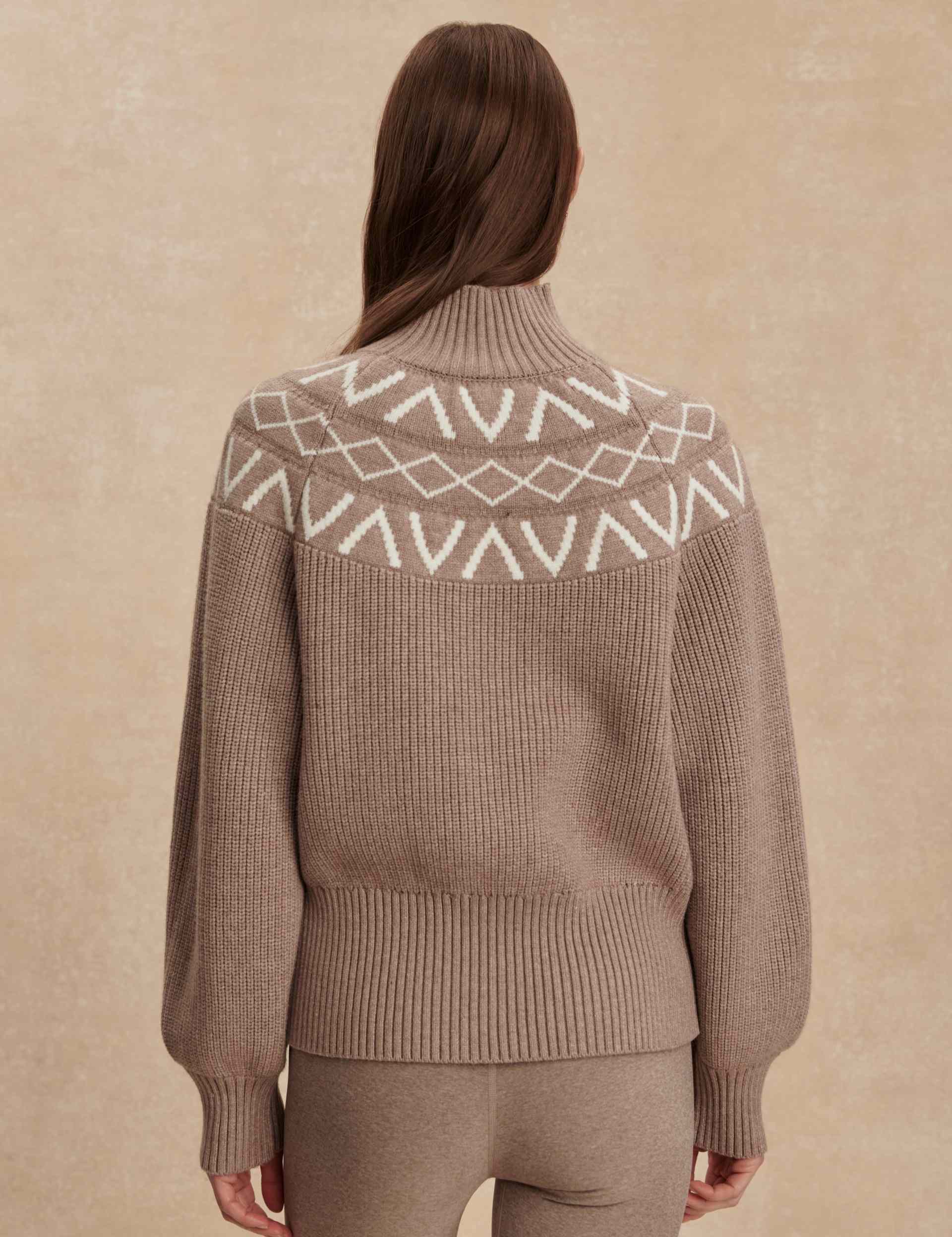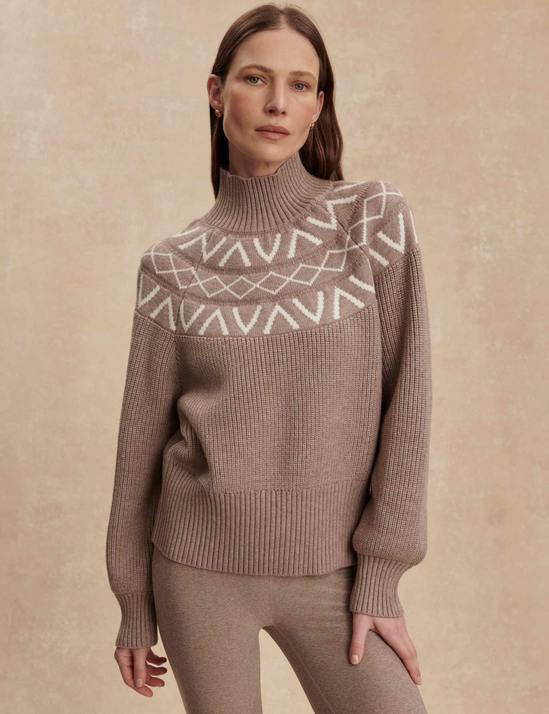 Elevate your winter wardrobe with the Marcie Fair Isle Yoke Knit, a statement piece for on and off the mountains. This sweater boasts a chic turtleneck and balloon sleeves, complemented by an intricate all-over ribbed design and a contemporary V monogram Fair Isle yoke for an effortlessly stylish ensemble.
